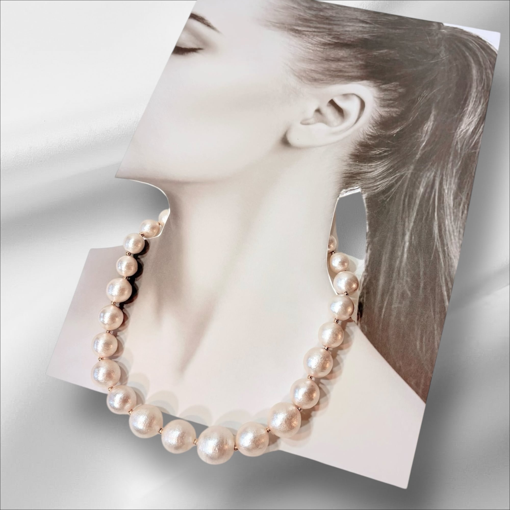 コットンパールを使用したアクセサリーのシリーズが入荷いたしました。コットンを圧縮して作られたパールはとても軽く、セミマットな色合いと質感が魅力的です。3サイズの大粒のパールを並べたボリュームのあるネックレスは柔らかなお色味で女性らしさを優しく引き出してくれます。留め具は長さ調節のできるゴールドのチェーンと小さなパール付きでエレガントな首元に。