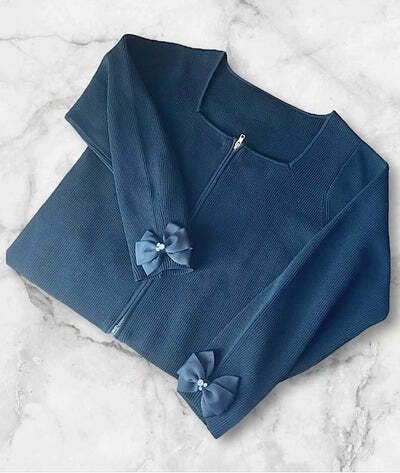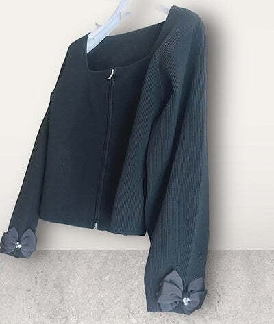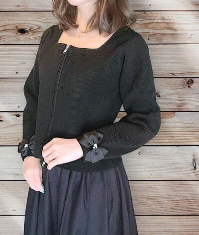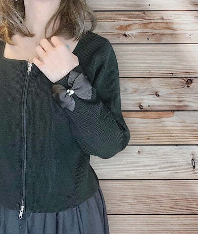 CLOSE SALE★DCP0002-【デコレーションコレクション】スクエアネックダブルジップカーディガン・グログランストーンリボン ¥8,800