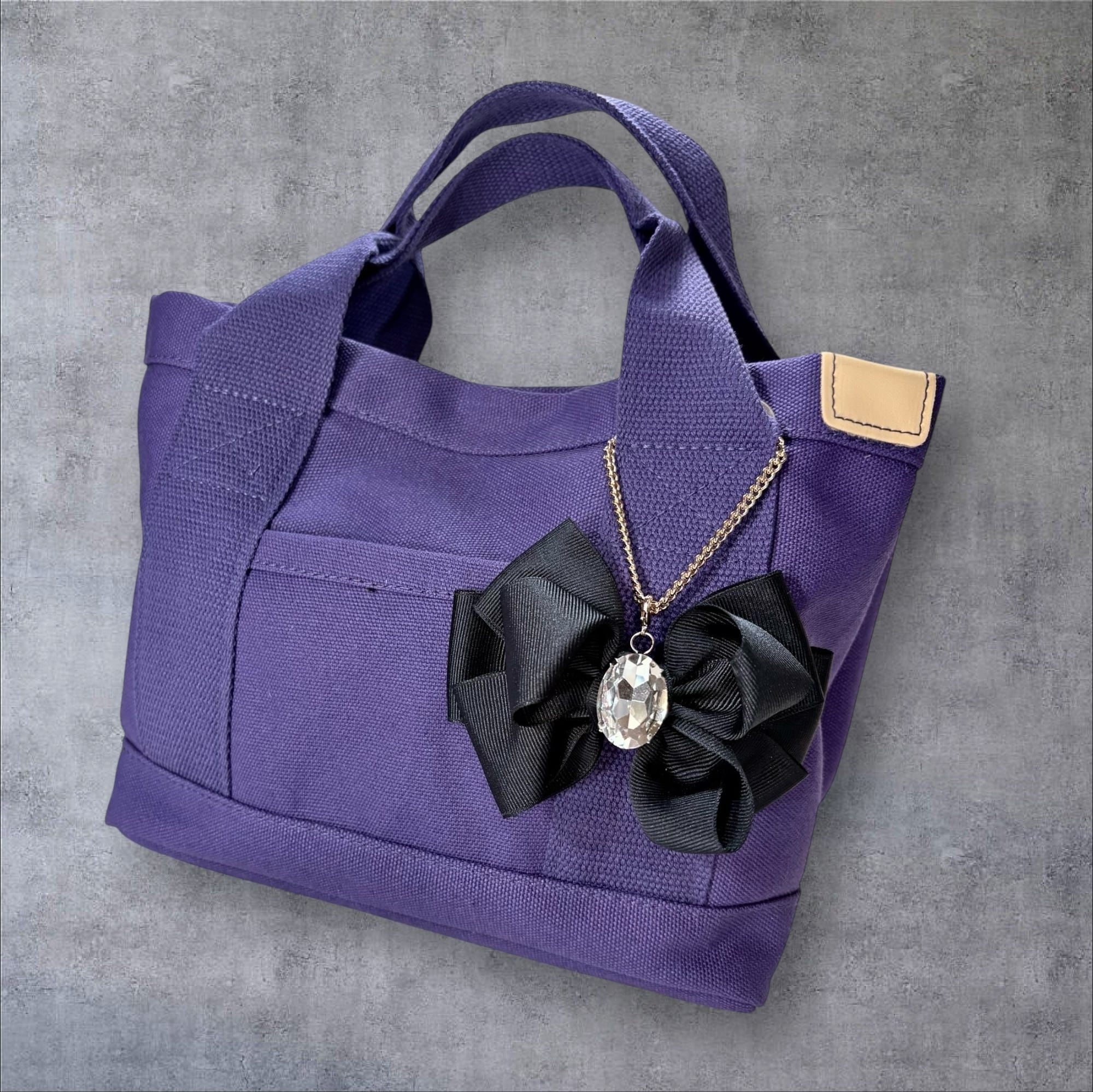 デイリーに使いやすいキャンバス生地のトートバッグの登場です。人気のツイストリボンにビジューを取り付けたチャームをセットしており、カジュアルにお使いいただけます。