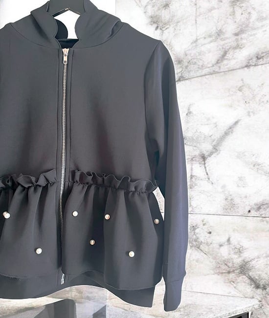 分厚すぎず長い季節活躍してくれるパール付きスカラップパーカー。