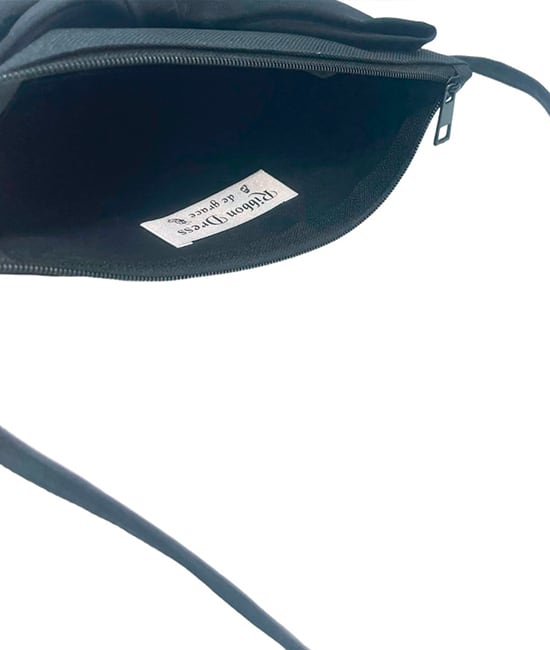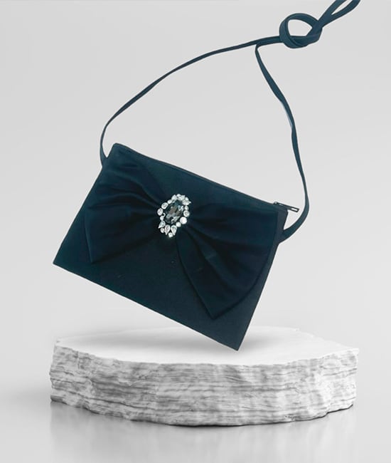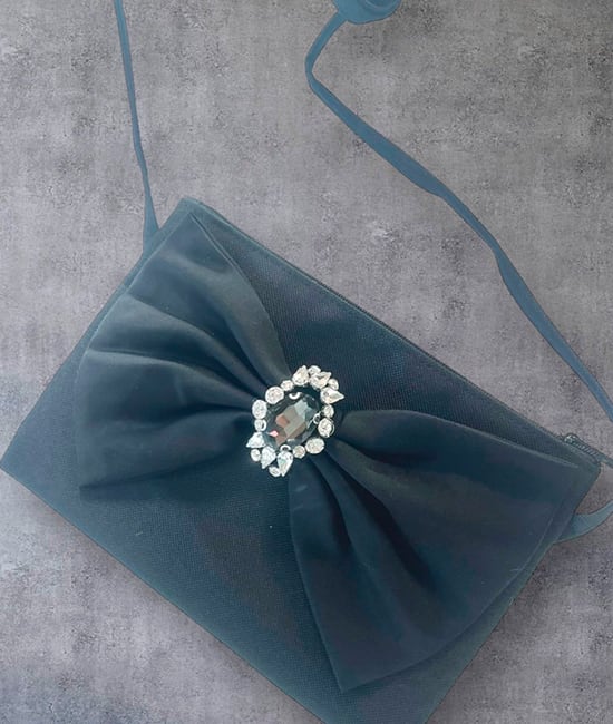 カジュアルなポリ素材のポシェットに上品なリボンとビジューをあしらいました。