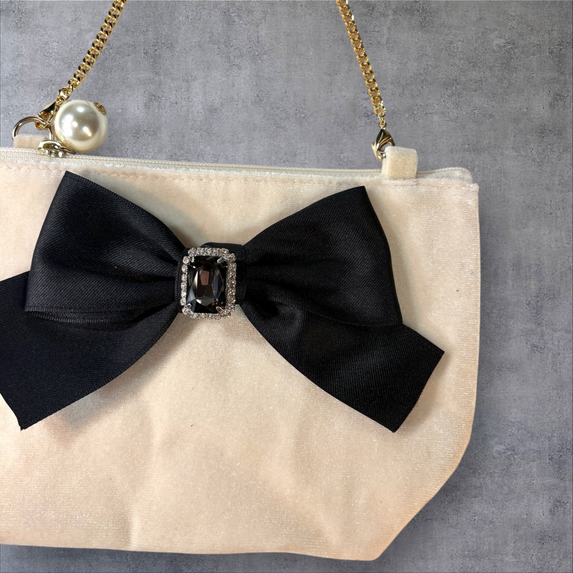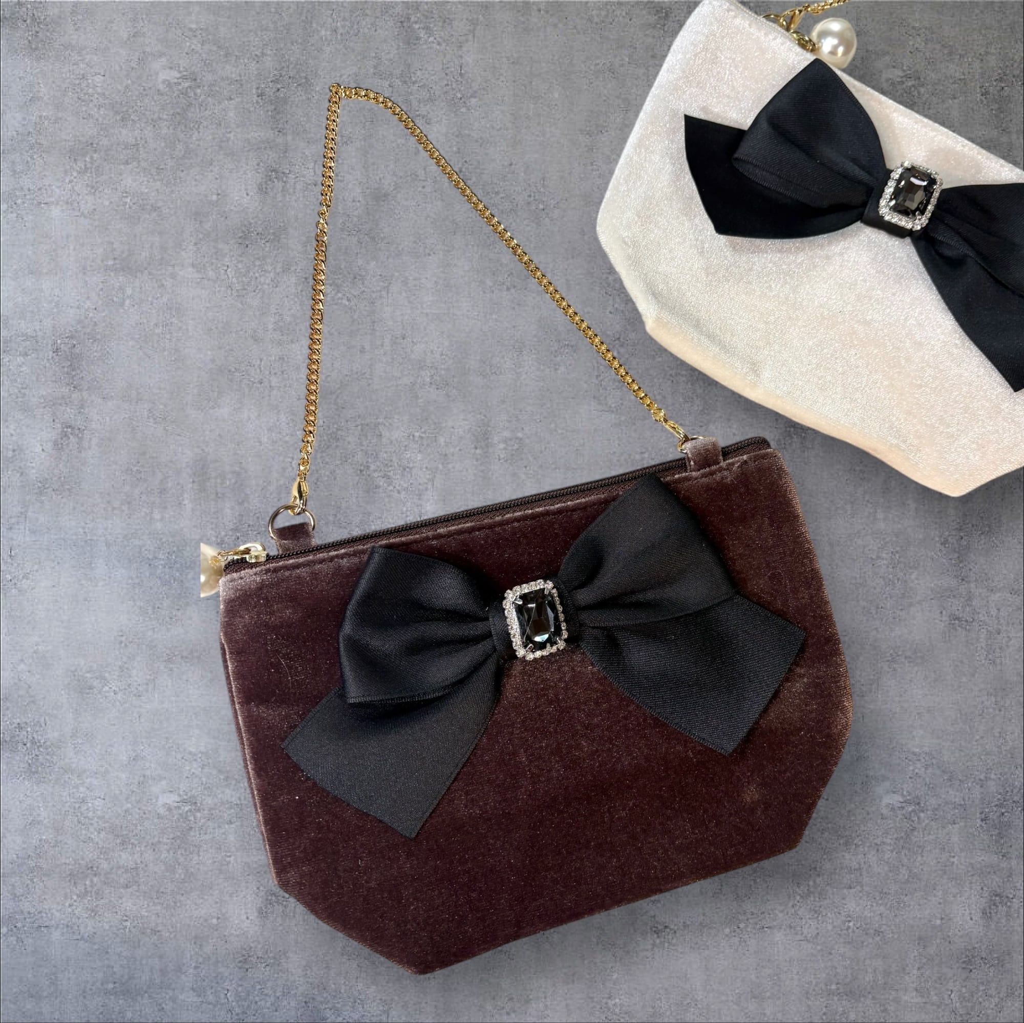しっとりとしたベロアポーチに取り外しができるチェーンをつけました。キュートなリボンとビジューをあしらい、フェミニンなデザインに。ミニバッグとしてもお持ちいただけます。