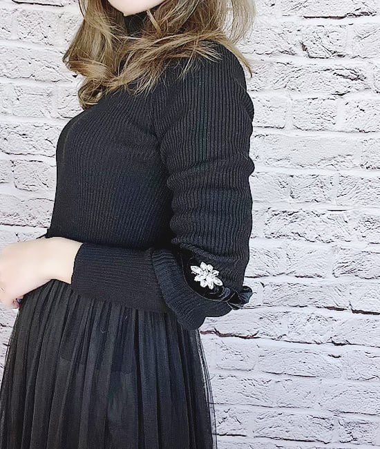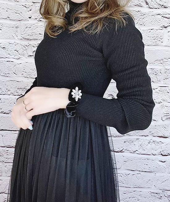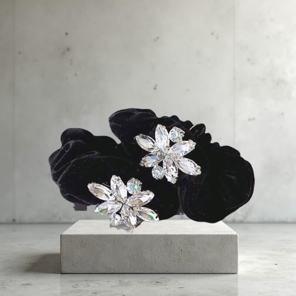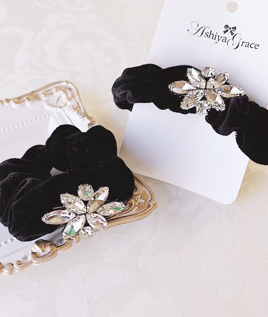 オリジナルシュシュの登場です。輝きが美しいビジューのストーンを使用したモチーフは高級感があり、とても華やかです。腕にブレスとしてお付けいただいてもファッションのアクセントとなり、幅広くコーディネートにお役立ていただけるデザインです。