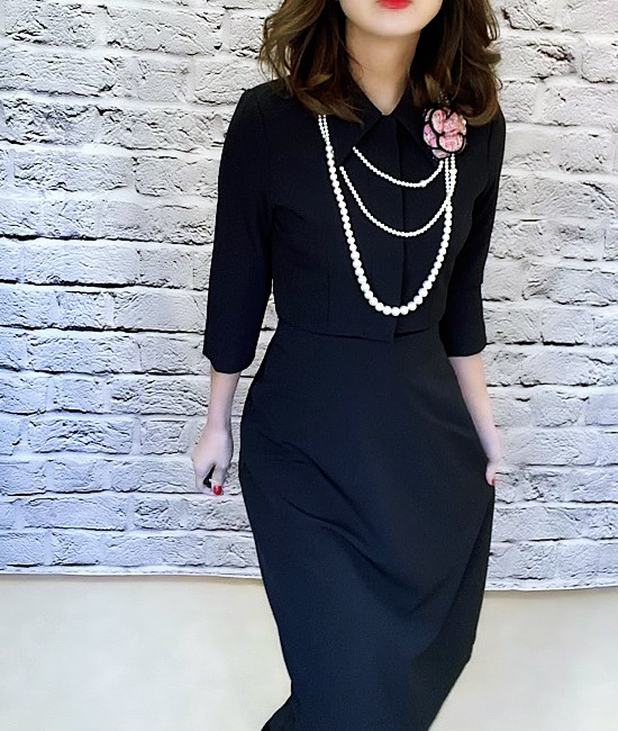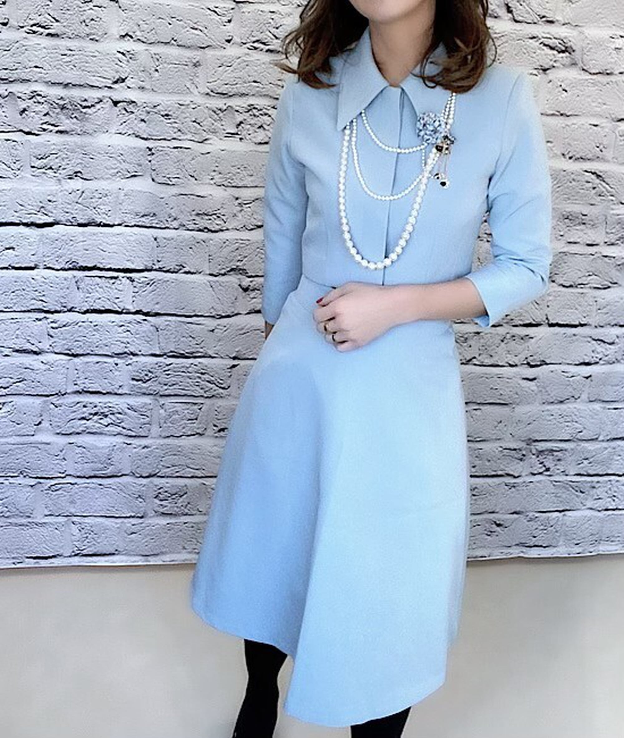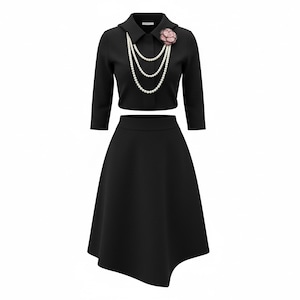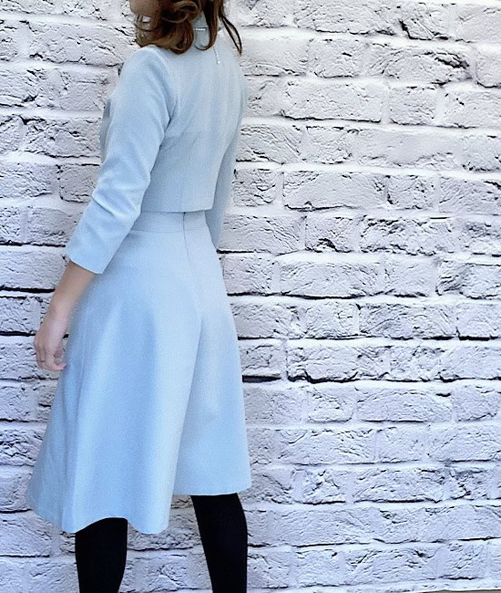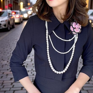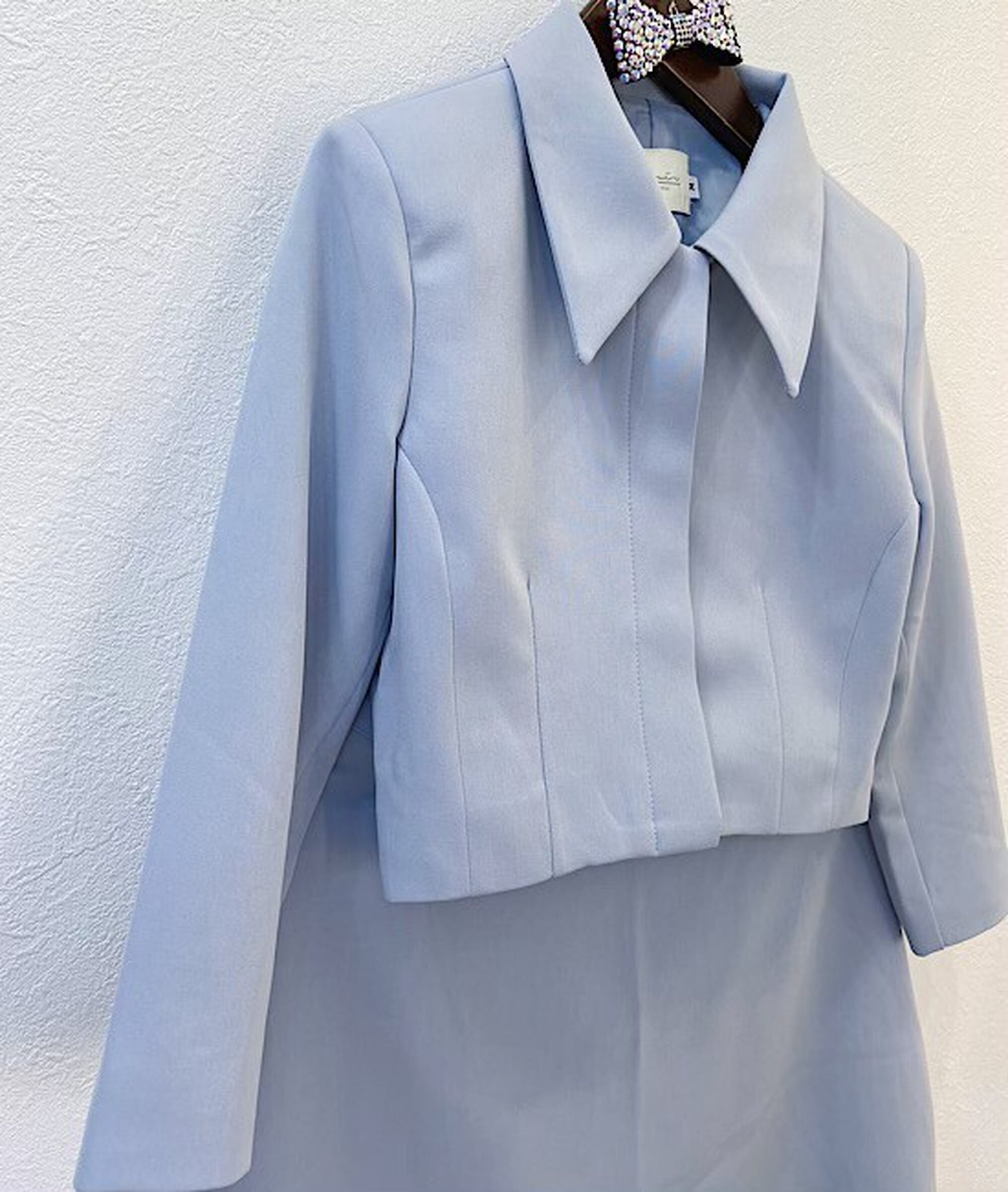 大変上品な雰囲気のスーツです。ウエストが細めなので着やせして見せてくれます。ジャケットもショート丈なので脚長効果も抜群です。下にはインナーを着て合わせていただけますと安心してお召いただけます。お式やフォーマルシーンにおススメです。