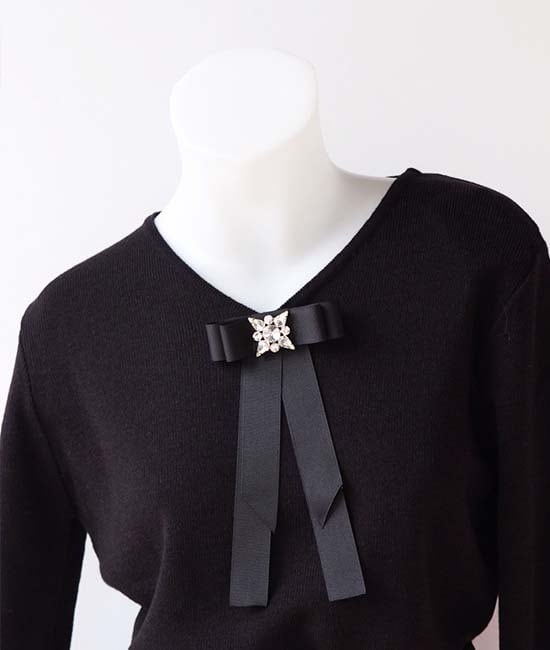 芦屋グレイスのカスタマイズリボンシリーズ第二弾。ツヤのあるグログランテープをリボンに成形し、大粒のビジューをあしらった存在感抜群のブローチです。シンプルな装いもゴージャスにランクアップ。セレモニースタイルやデイリーのファッションに合わせたカスタマイズも可能となっております。