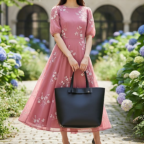 ハリのある型押しの合皮を使用したベーシックなトートバッグにクラシックリボンを合わせました。肩掛けしやすい長めの持ち手、広めのマチと利便性も抜群。シンプルながら品のあるデザインは学校行事やビジネス、デイリーにも幅広くお使いいただけます。