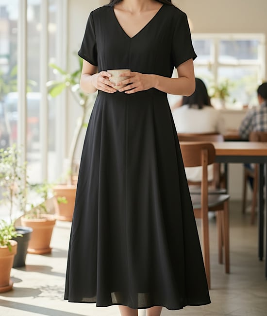 タック入りのシルエットが綺麗なワンピースが入荷致しました。上品なフレア感がグッと女性らしさを増してくれ、半袖なので、二の腕もカバーします。シンプルなので、アクセサリーやお履きものによって、アレンジをお楽しみください。着まわし抜群、万能ワンピースです。