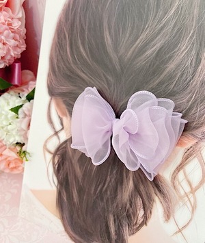 透け感のあるチュールが折り重なった美しいリボンです。フチのワイヤーでリボンをしっかりと形作ってくれます。こっくりとした深みのあるお色で華やかなヘアスタイルに。手首につけてブレスレットにしても素敵です。